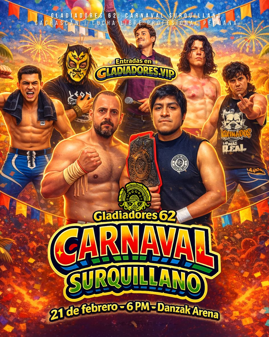 GLADIADORES 62: CARNAVAL SURQUILLANO llega recontra veraniego, bajo el sol de los 4 reflectores LED del Danzak Arena, en una noche donde la lucha libre se mezcla con fiesta, calor y pura actitud. Saca tu camisa o blusa caribeña, tu shortcito, las sandalias y esos lentes que te hacen sentir piola. Haz de cuenta que te vas a la playa… de estacionamiento, para vivir la verdadero cachascán surquillano.